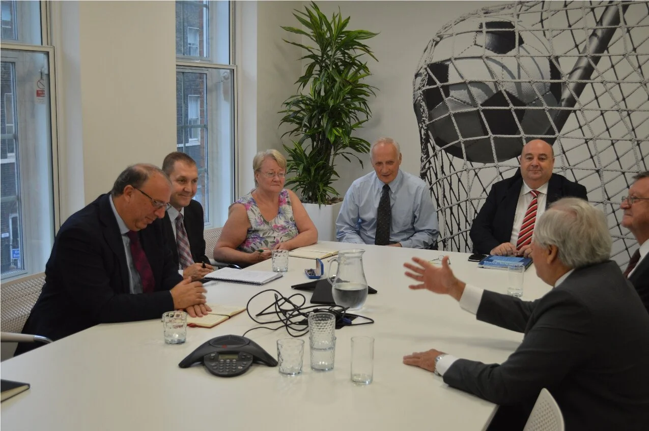 FIVB President Dr. Ary S. Graça F° and CEV President Aleksandar Boricic with (from left to right): Sport England Chairman Nick Bitel, Volleyball England Chairman Adam Walker, CEO Janet Inman, Vice-chair Keith Nicholls and Chief Operating Officer Stewart Dunne